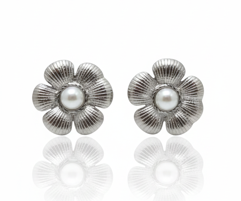 Arete de acero inoxidable con forma de flor con u natural perla en medio.